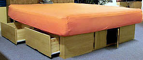 Schubladensockel von Wigwam haben 4 große Schubläden, vorne eine Doppeltür für große Sachen wie Bügelbrett, Staffelei, Staubsauger usw. Dieser Sockel ist nur für Wasserbetten erhältlich.